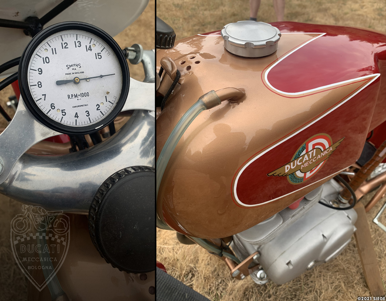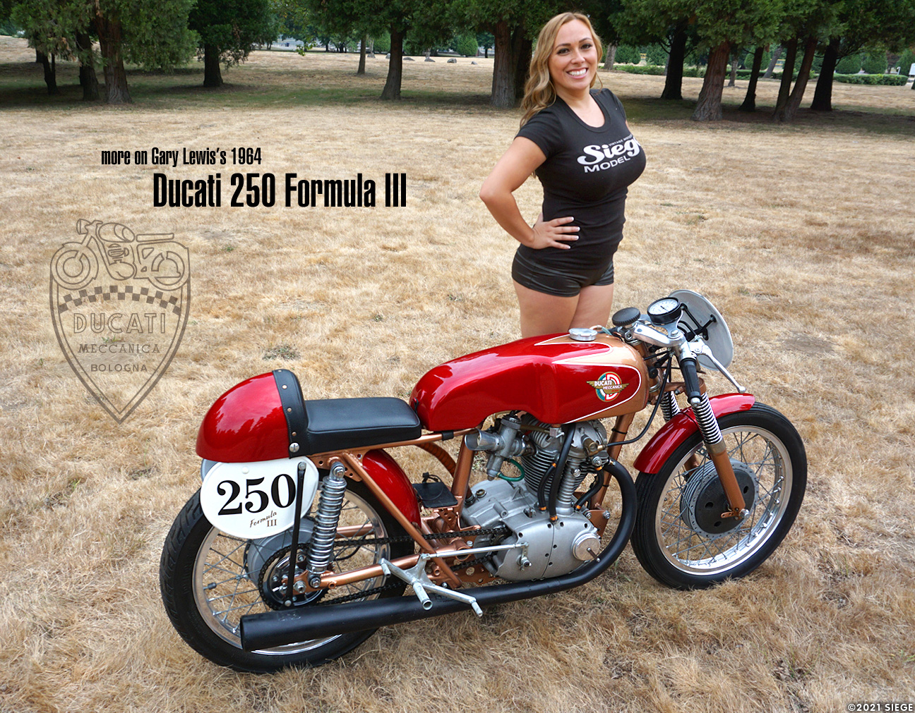 Although without a number, the engine is definitely a 250 F3, the frame was almost certainly originally a 175 F3. My interpretation of the history of this motorcycle is that at some stage a 250 F3 engine was installed in a 175 F3 chassis. The engine appears to be 1961, (or possibly 1960 if it was one of the 250 prototypes)- the chassis possibly 1959 or 1960, with some later equipment, such as 1962 front brake. |